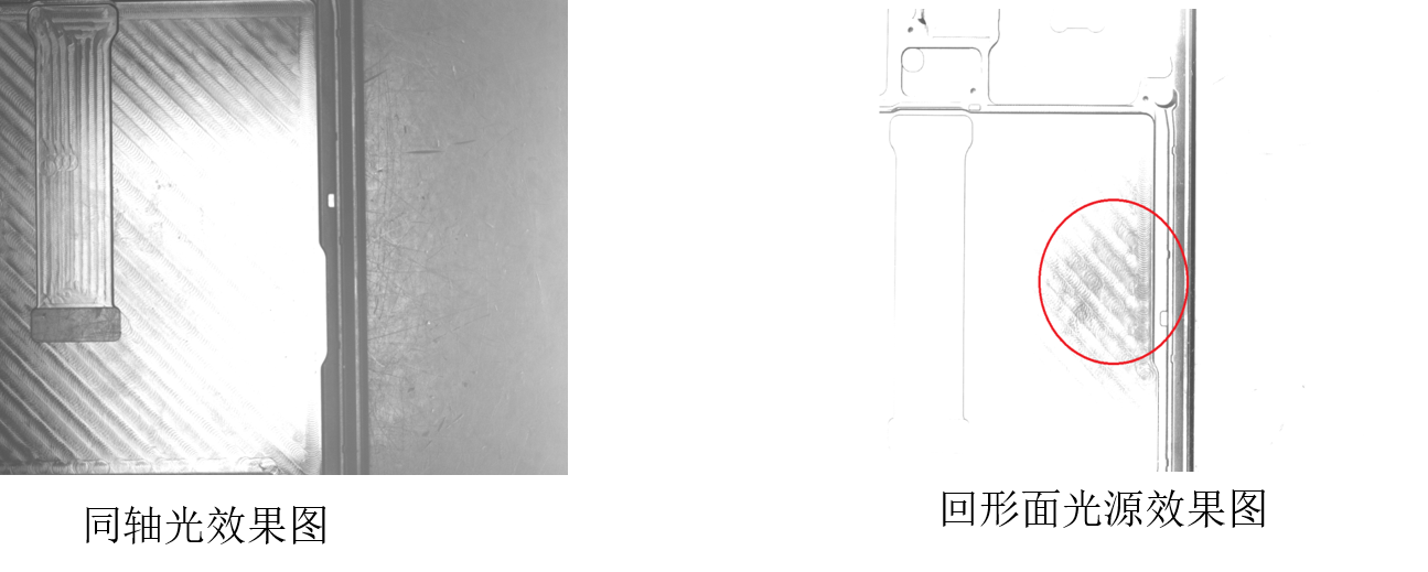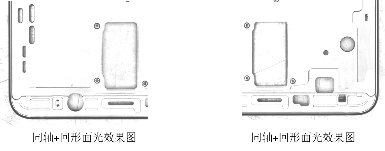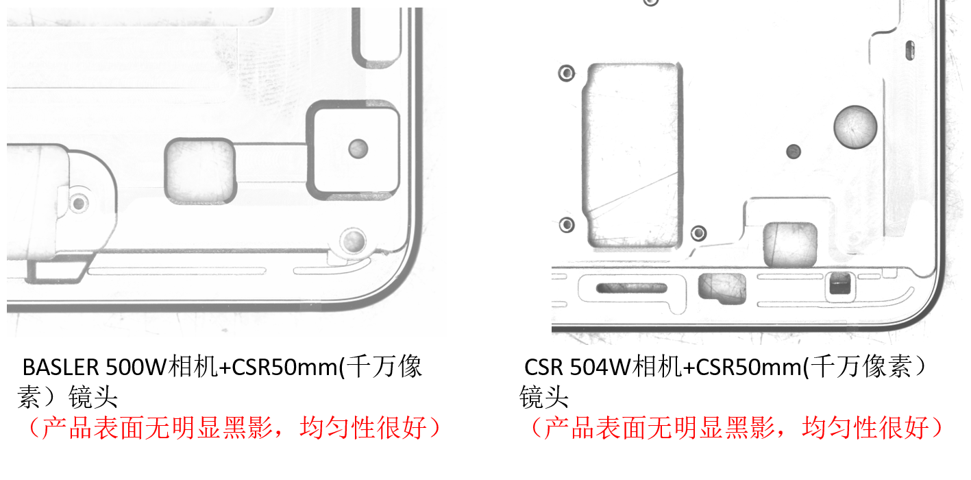 1.使用BASLER相机搭配COM,CSR,OPT,VS四种相机进行光学实验验证出在同样的光源条件下,COM35mm镜头的图像均匀性不是很好,有较大阴影产生;OPT340镜头 和VS35mm图像效果较为接近,但是还是有较小阴影产生;CSR50mm(千万像素)镜头的图像效果均匀性很好,产品整体亮度均衡,无明显阴影