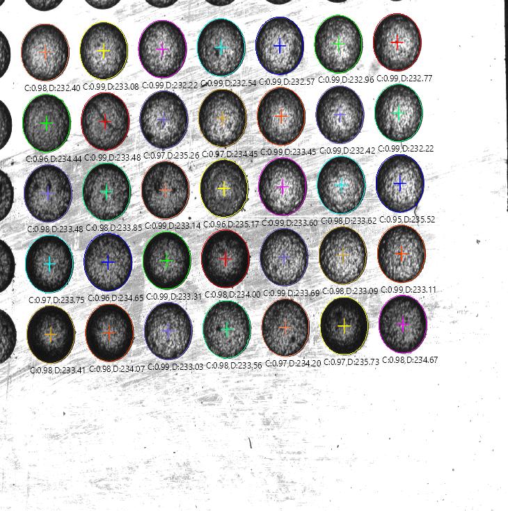 目前实验来看,可以检测出标签有无以及有没贴歪斜,印刷字符只能检测出缺陷比较大的产品,具体还要以实际缺陷产品来模拟确认。此方案适合65mm以下产品,由于颜色太多,不能所有产品都兼容。
