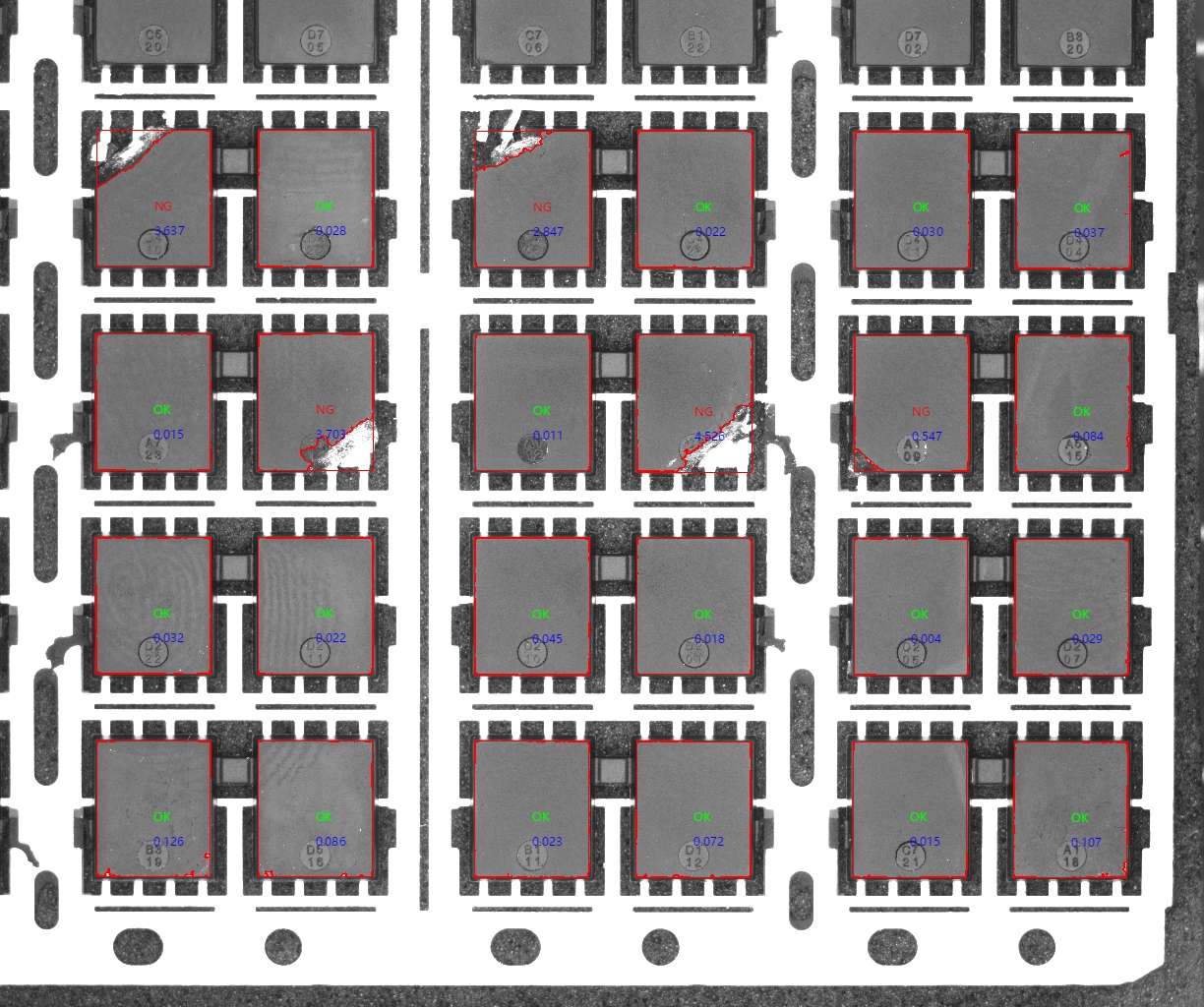 根据目前样品实验效果及处理结果来看,是可以对胶的轮廓提取及处理的,但两边的线路会有少许干扰,特别是在胶量少的情况下影响更大。如果有其他颜色电路软板背景,或者胶量更加少(胶?。┬枰嘤Φ牟方胁馐圆拍苋啡闲Ч欠衲芄患觳?,同时需要保证软板平整