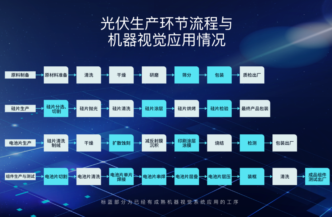 在视觉的应用方向中,缺陷检测的占比超过40%。在光伏产品的生产流程中,从硅片到组件生产,均会大量应用视觉缺陷检测技术进行质量检测。